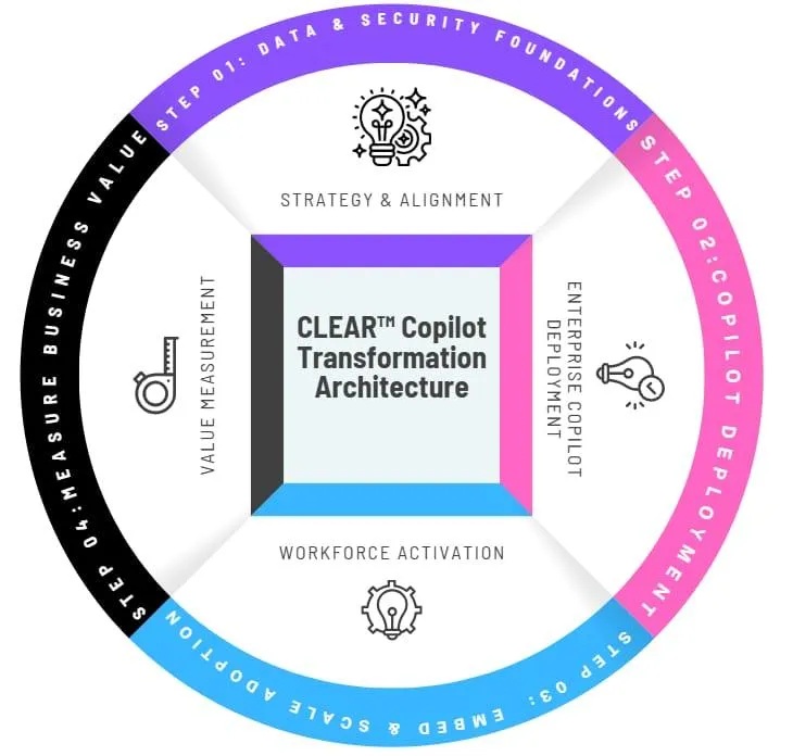 Our architecture closes this gap by aligning leadership activation, secure enterprise deployment, and workforce adoption. Rather than treating AI as a one- time implementation project, we guide organizations through a transformation system designed to embed Copilot into everyday work and deliver measurable business impact.